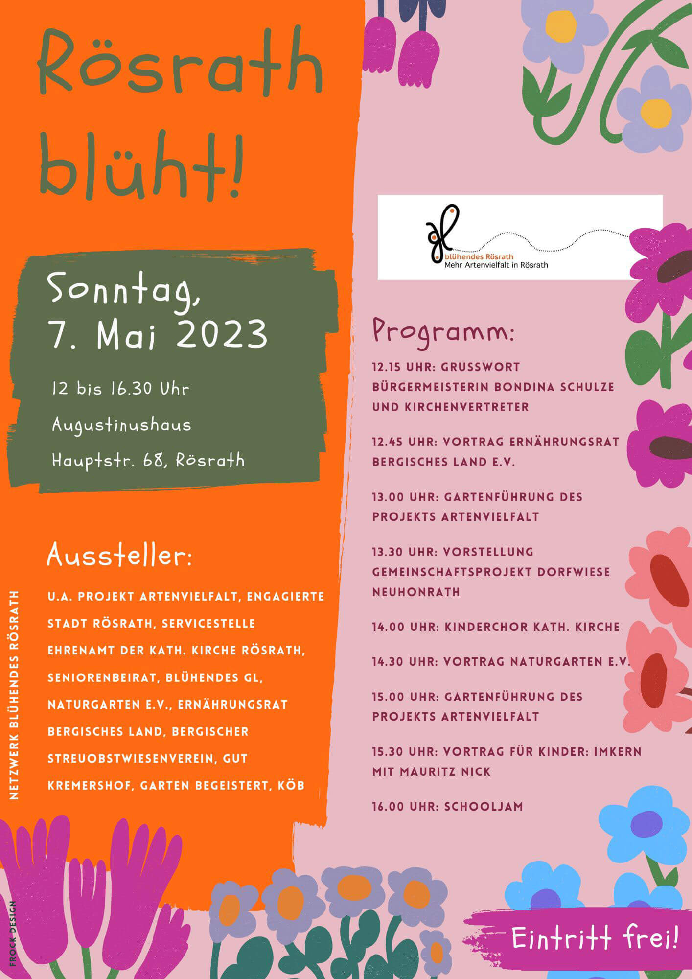 Am Sonntag, 7. Mai, stellen sich verschiedene Initiativen in Rösrath vor. Nach der Begrüßung durch Bürgermeisterin Bondina Schulze und Vertreter der Kirchen, berichtet der Ernährungsrat Bergisches Land um 12.45 Uhr über seine Projekte, wie z.B. die Aktivitäten der Arbeitsgruppe „Essbare Bildung. Kinder können am Stand Samentütchen basteln und dann vom „Blühenden GL“ befüllen lassen.